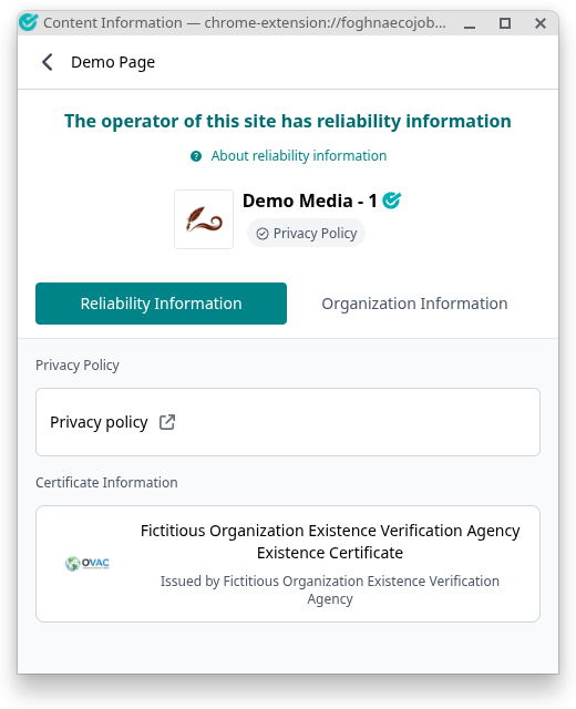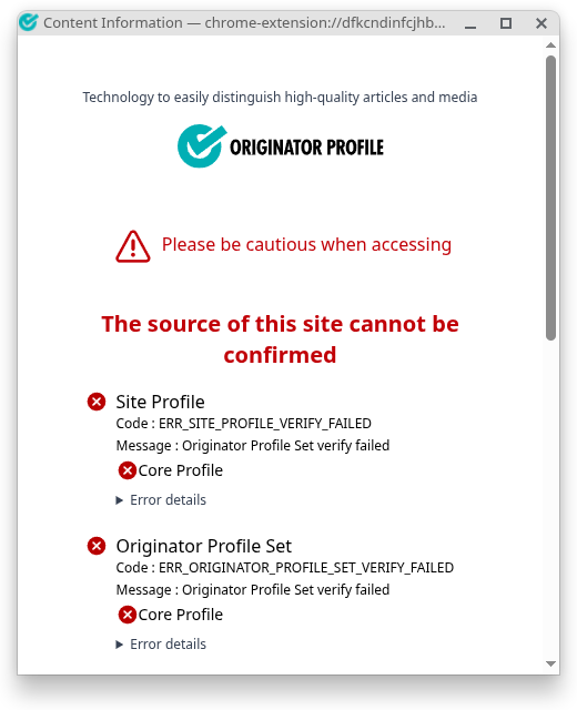 If VCs fail to validate, the extension will display a verification failed screen, warning the user that they may be browsing an unsafe site.