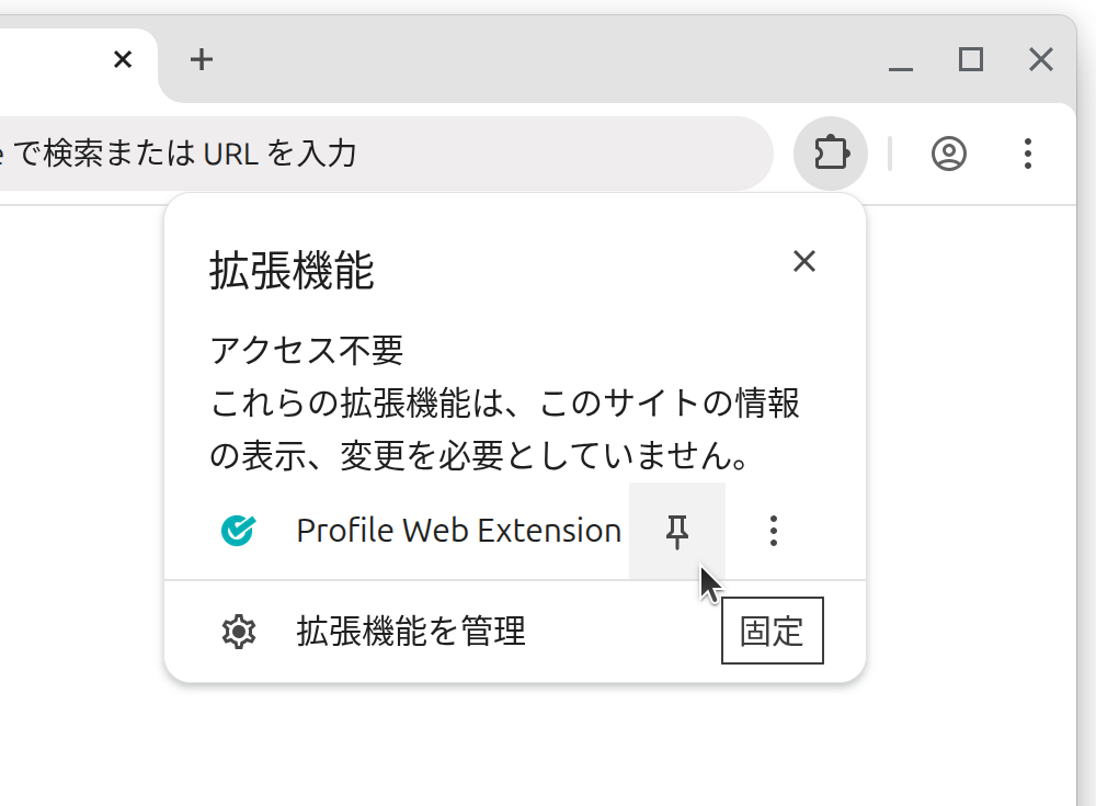 - Originator Profile 拡張機能 (Profile Web Extension) の横にある「固定」ボタン(📌 ピンのアイコン)をクリックします。