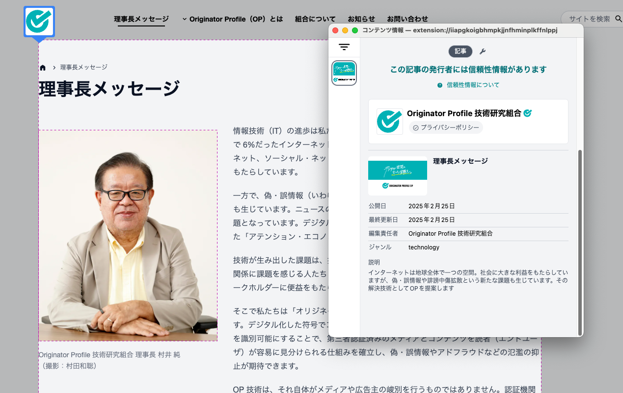 Originator Profile (OP) 拡張機能は、Web ブラウザー上で Originator Profile と Content Attestation の閲覧・検証を行うブラウザー拡張機能です。